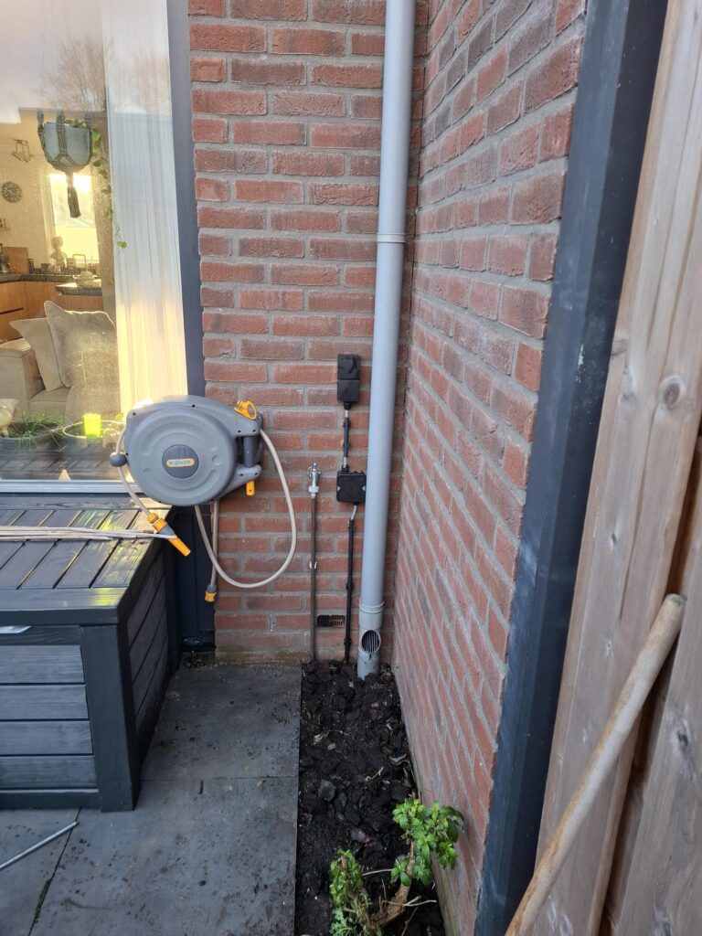 Wij hebben voor de opdrachtgever een aantal wandcontactdozen in hun tuin geplaatst. Het voordeel was dat de tuin nog leeg