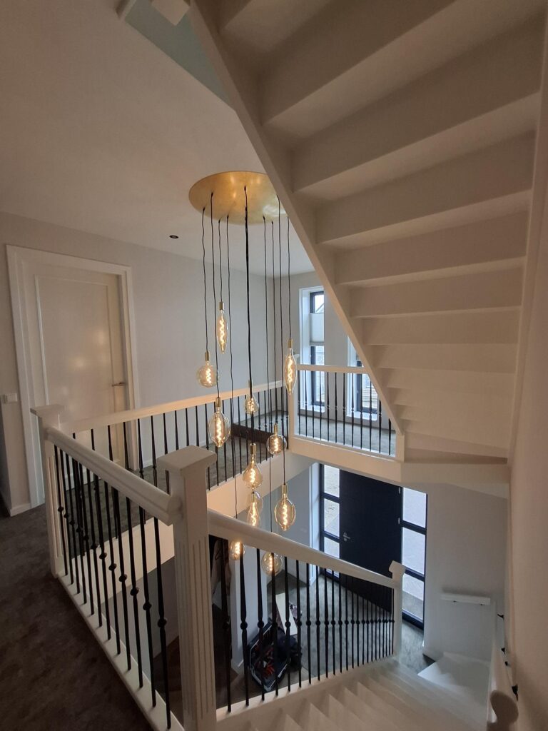 Voor deze opdrachtgever hebben wij een designarmatuur opgehangen. De vide waar de armatuur moest komen te hangen was hoog. Gelukkig