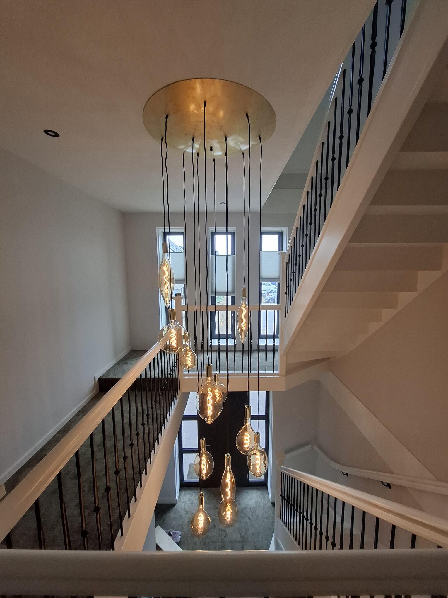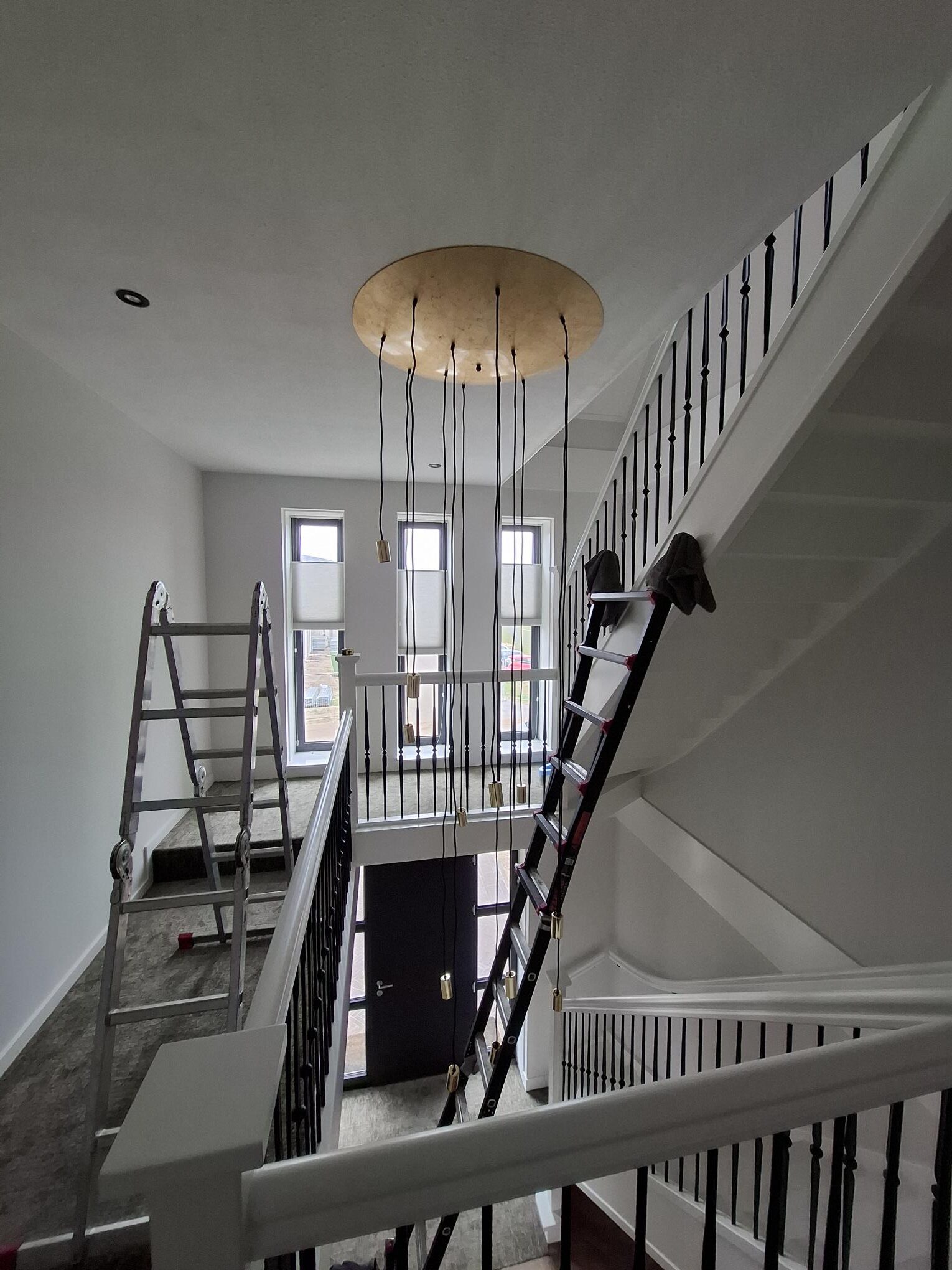 Voor deze opdrachtgever hebben wij een designarmatuur opgehangen. De vide waar de armatuur moest komen te hangen was hoog. Gelukkig was het met de ladder mogelijk om bij de aansluiting te kunnen. Na veel inspanning is het gelukt om de armatuur te monteren. Na het monteren hebben wij de lampen afgesteld op de juiste hoogte voor de vrouw des huize.
